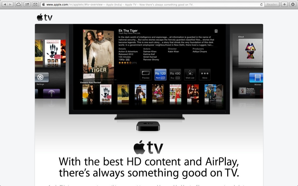 Apple Tv made a silent appearance on the Apple India website yesterday with a price tag of Rs. 7900(Rs.8295- with taxes). Apple has started giving importance to the Indian market since the launch of iPhone 5. The iPhone 5 had sold out within a few hours of its initial launch in India. Apple is now trying to push its Apple Tv in a similar manner hoping to increase its profit. The company had started its groundwork to launch the Apple Tv long back, by adding regional content to the iTunes store. A lot of Bollywood movies and music have been added to the iTunes store. Indian media enthusiasts and Apple fans have been waiting for a long time to get their hands on the Apple TV. The Apple TV has a lot of advanced features like AirPlay mirroring which allows users to mirror a Mac/iPhone/iPad display to a larger screen, iCloud sync which sycs all your media content with multiple devices, Live News and Sports, Video streaming(YouTube,VIMEO) and Internet browsing(via Ethernet and WiFi). I don't think India is a good market for Apple TV since people have adapted themselves to watching movies on television or internet. Watching movies on Apple Tv requires the user to buy/rent it from the iTunes store. Average cost of a movie in iTunes store is Rs. 500 and most people can't afford to pay such an exorbitant amount on a regular basis. The Apple Tv is hence targeted to the elite society. Sales of Apple Tv in India will be considerably low as compared to the sales in other parts of the world.